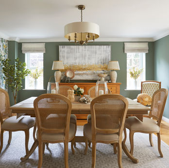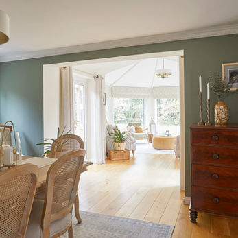 In the dining room, we introduced a timeless floral wallpaper, painting the walls in Farrow & Ball Green Smoke and completing the look with a new dining table, chairs, lamps and carefully chosen décor.