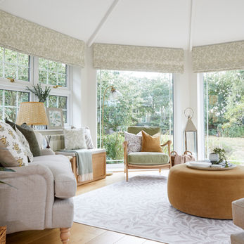 The garden room was given a softer, more vibrant feel through nature inspired fabrics with pops of ochre and green layered into patterned cushions and accessories to create a warm and inviting space.